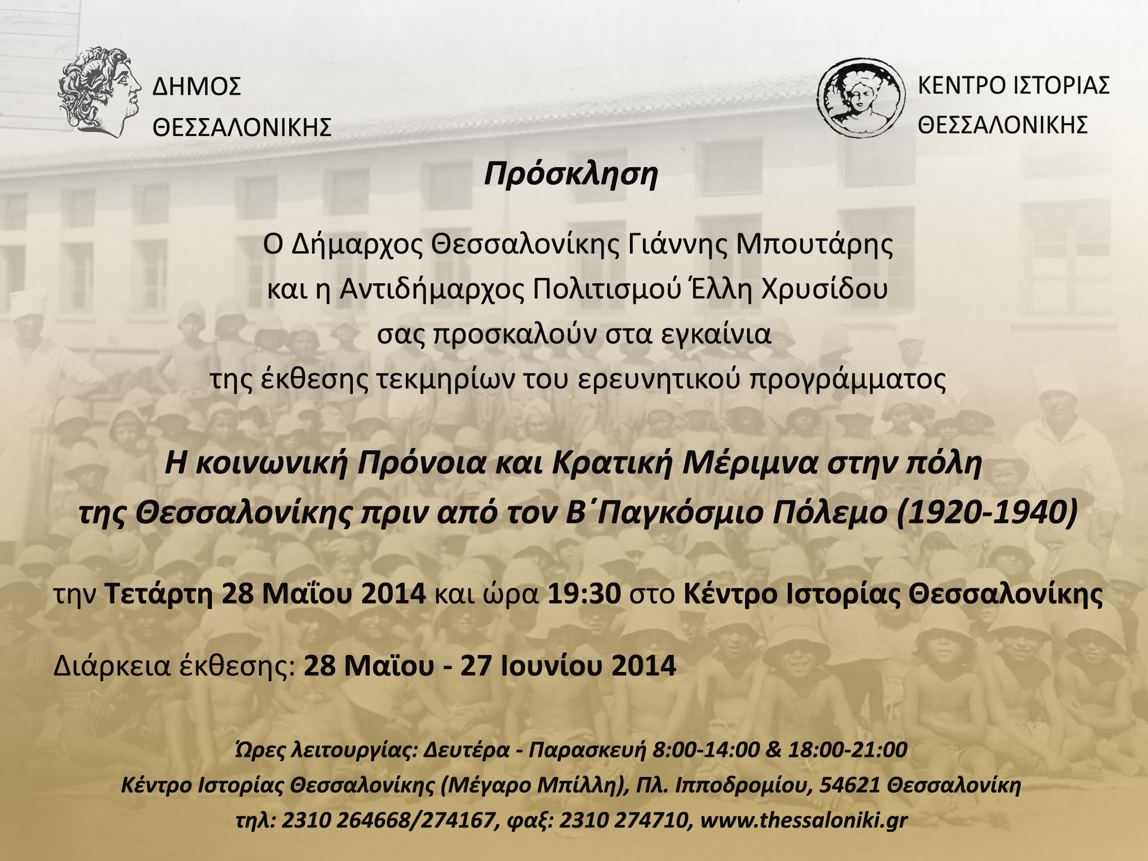 Πρόσκληση έκθεσης τεκμηρίων του ερευνητικού προγράμματος "Η Κοινωνική Πρόνοια και Κρατική Μέριμνα στην πόλη της Θεσσαλονίκης πρίν από το Β' Παγκόσμιο Πόλεμο (1920 - 1940)"