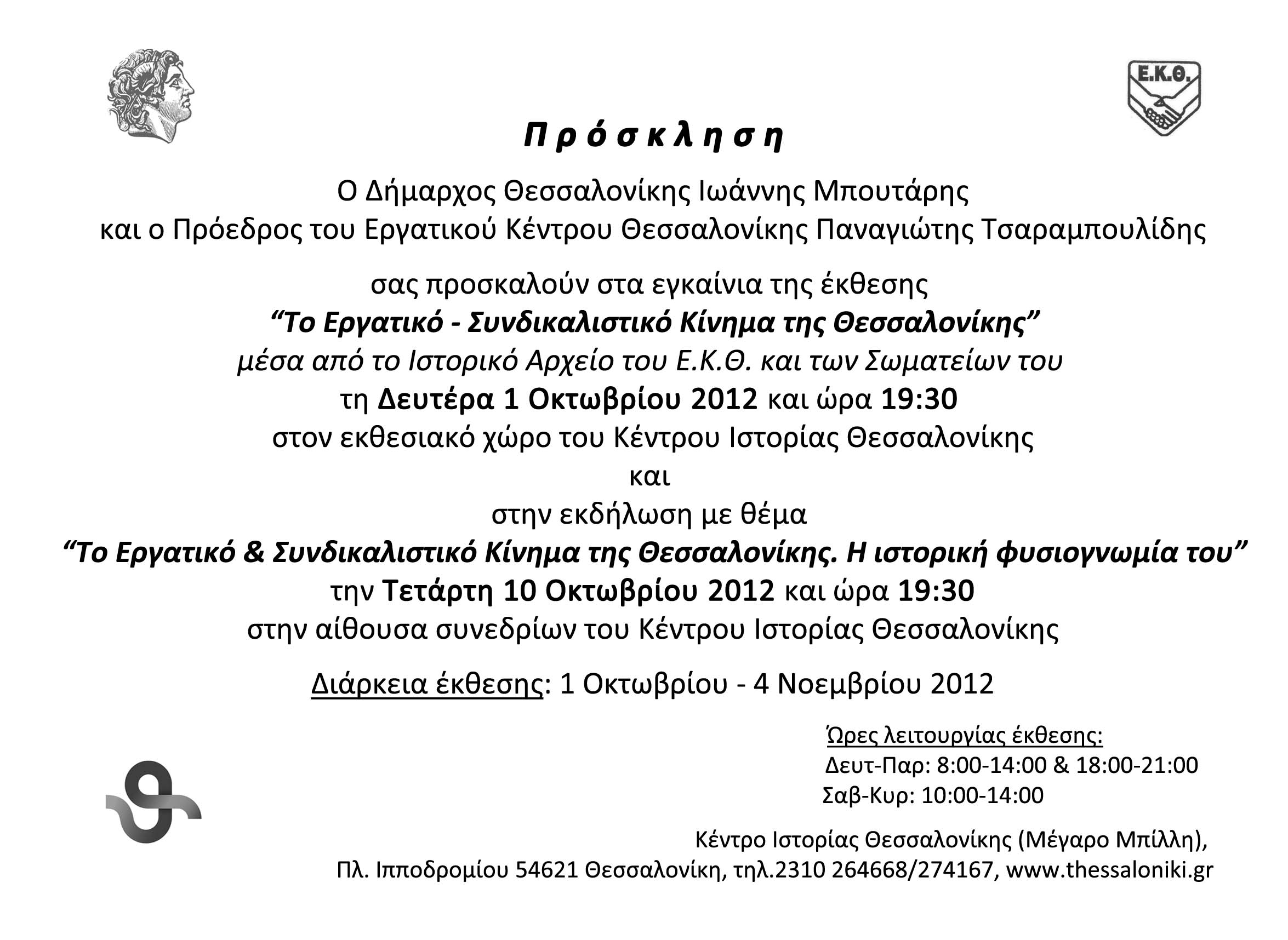 Πρόσκληση έκθεσης «Το Εργατικό – Συνδικαλιστικό Κίνημα της Θεσσαλονίκης μέσα από το ιστορικό αρχείο του Εργατικού Κέντρου Θεσσαλονίκης και των σωματείων του"