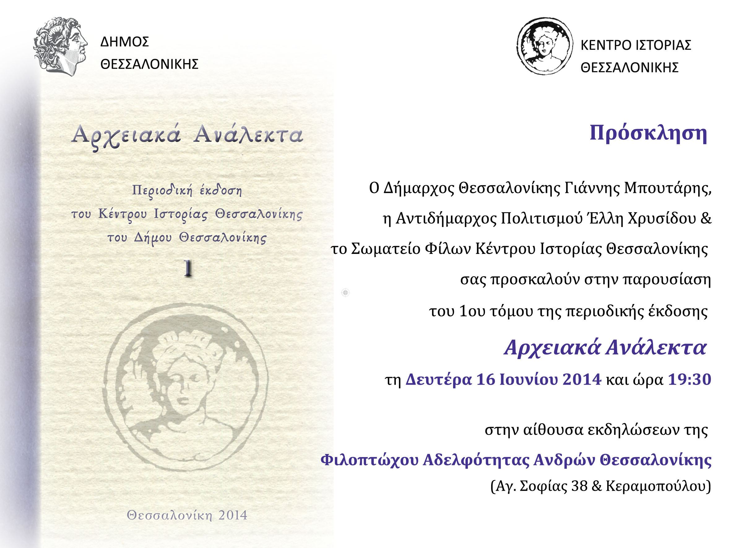 - Πρόσκληση βιβλιοπαρουσίασης του επιστημονικού περιοδικού «Αρχειακά Ανάλεκτα, τόμος 1»