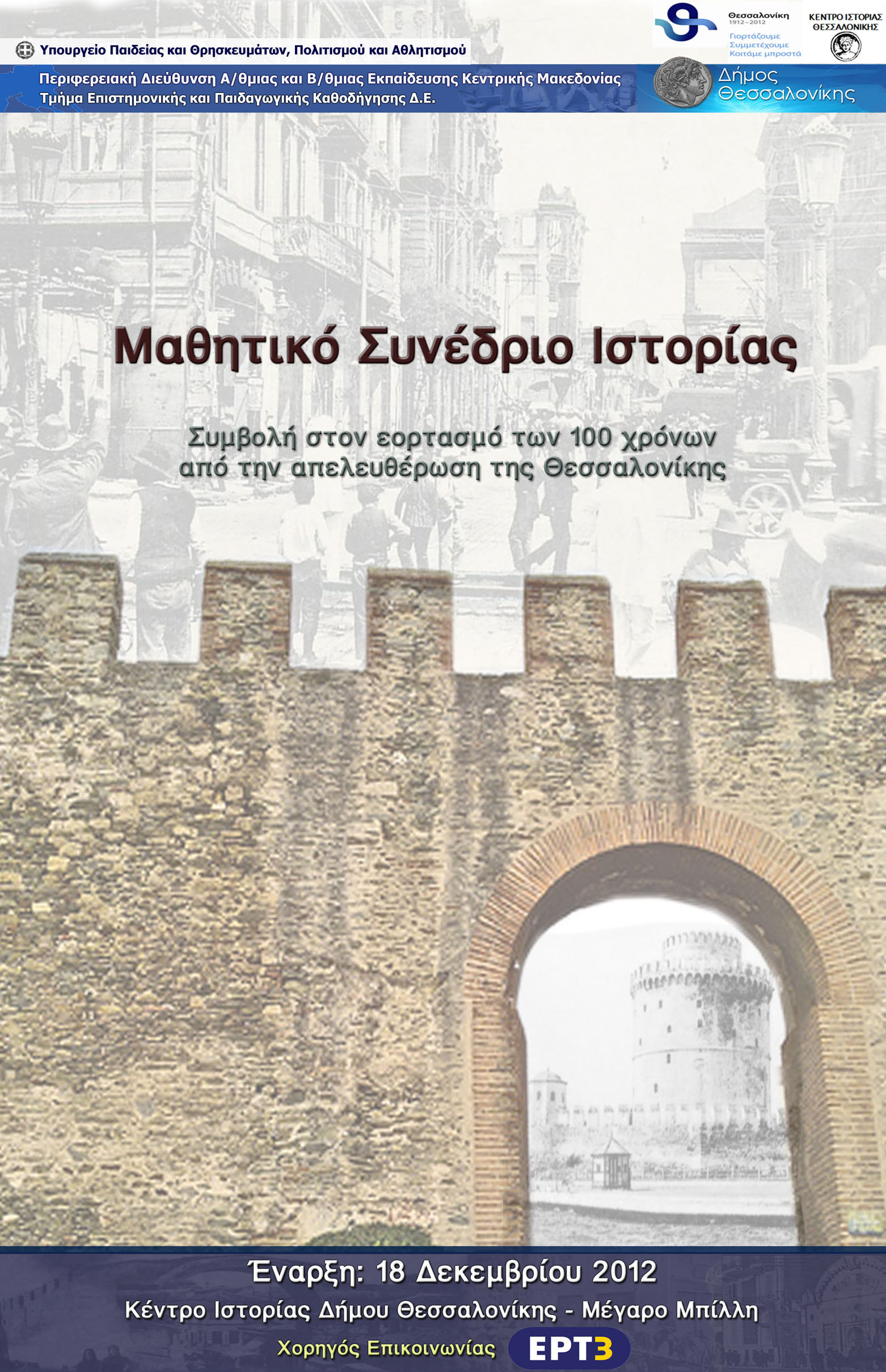 Αφίσα Μαθητικού Συνεδρίου Ιστορίας με θέμα "Συμβολή στον εορτασμό των 100 χρόνων από την απελευθέρωση της Θεσσαλονίκης"