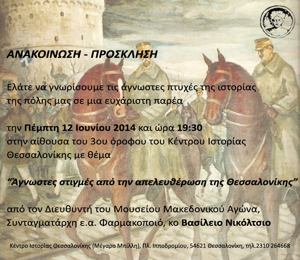 - Ανακοίνωση - Πρόσκληση της εκδήλωσης με θέμα "Άγνωστες στιγμές από την απελευθέρωση της Θεσσαλονίκης"