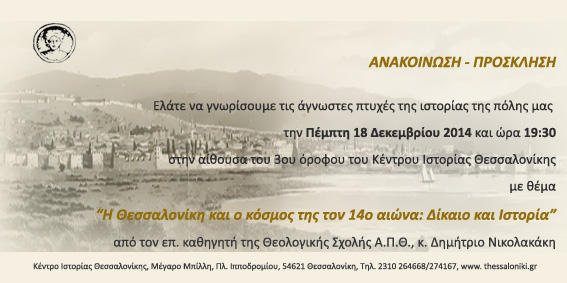- Ανακοίνωση - Πρόσκληση της εκδήλωσης με θέμα "Η Θεσσαλονίκη και ο κόσμος της τον 14ο αιώνα: Δίκαιο και Ιστορία "