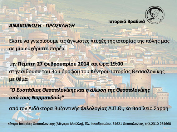 - Ανακοίνωση - Πρόσκληση της εκδήλωσης με θέμα "Ο Ευστάθιος Θεσσαλονίκης και η άλωση της Θεσσαλονίκης από τους Νορμανδούς"