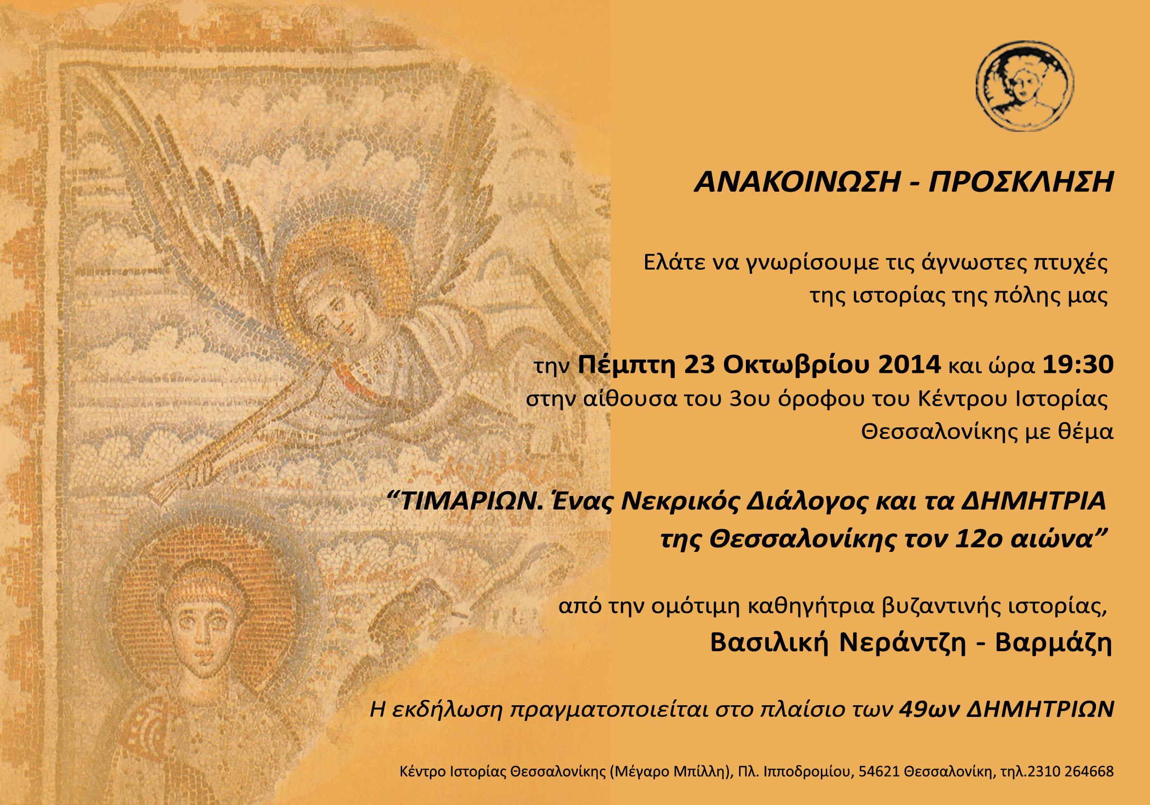 Ανακοίνωση - Πρόσκληση της εκδήλωσης με θέμα "ΤΙΜΑΡΙΩΝ. Ένας Νεκρικός Διάλογος και τα ΔΗΜΗΡΙΑ της Θεσσαλονίκης τον 12ο αιώνα"